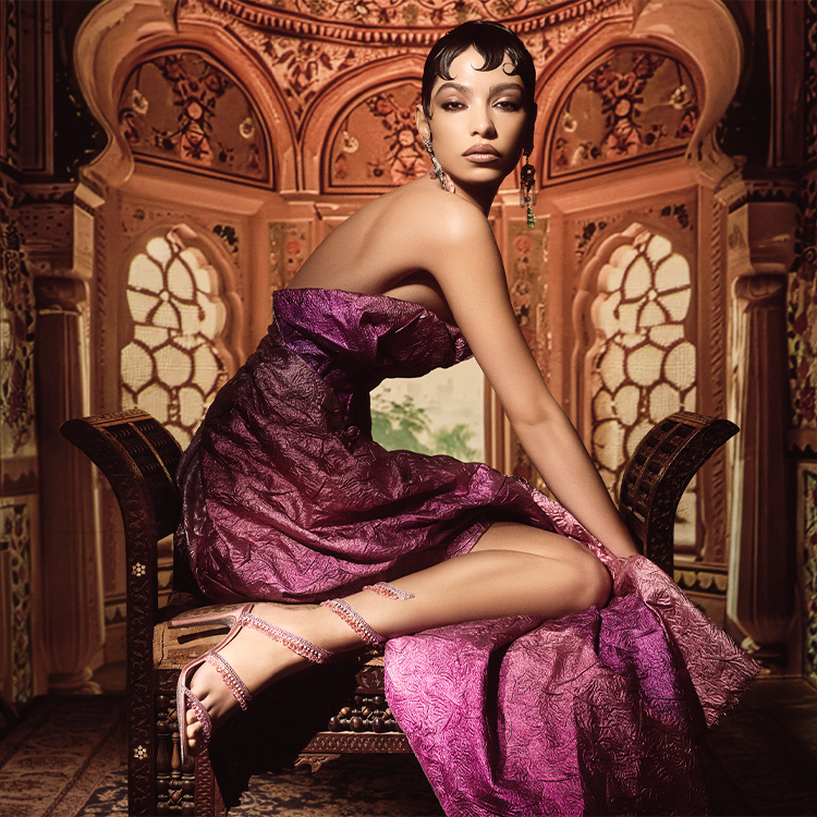 The iconic Chandelier evolves with this extra-long serpent, wrapping around the leg up to the knee. The boldness of the design is balanced by the romantic powder pink nuance and the refined tone-on-tone crystals that jingle with every step.